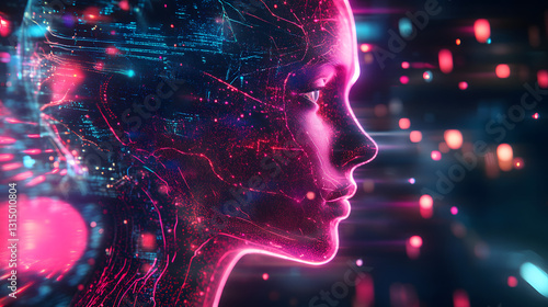 A digital AI mind surrounded by neon lights, generating complex data visualizations and real-time neural interactions.