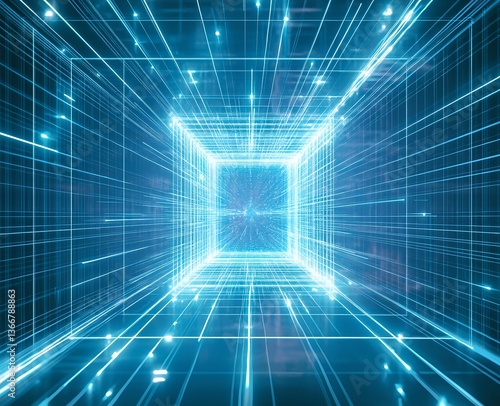 A digital art illustration of a holographic energy field with light rays, a technological grid, and a glowing blue cube symbolizing airflow