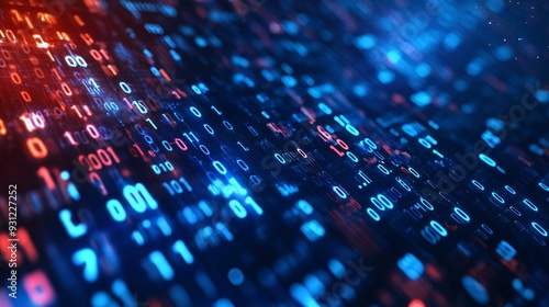 A digital background with cascading binary code and light particles creating a futuristic effect