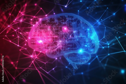 A digital brain with neon circuit patterns glowing in blue and pink, set against an abstract background of interconnected lines and dots representing data flow, artificial intelligence Generative AI