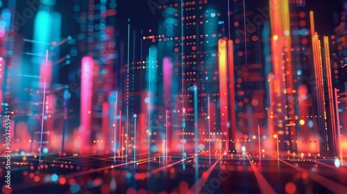 A digital cityscape with bright lights and a blue and purple sky.