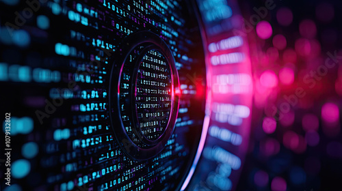 A digital close-up featuring glowing binary code and circular patterns, embodying technology and data security in a visually captivating manner.