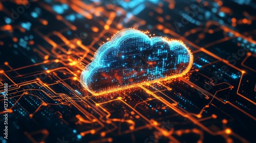 A digital cloud consisting of luminous particles, against a background of schematic patterns symbolizing cloud computing and modern technologies