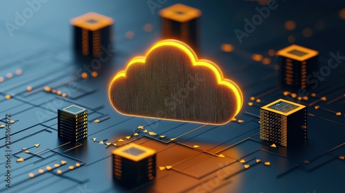 A digital cloud surrounded by glowing processors, symbolizing cloud computing and data storage technology.