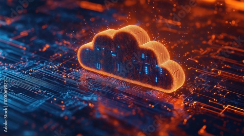 A digital cloud symbol glowing on a circuit-like background, representing cloud computing technology.