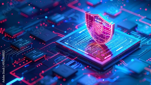 A digital cybersecurity concept with a glowing shield symbol on a computer chip, representing data protection and privacy in a high-tech environment.