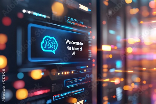 A digital display in a high-tech server room presents a chatbot interface with a blue brain symbol and the message "Welcome to the future of AI." The scene includes glowing data streams and coding