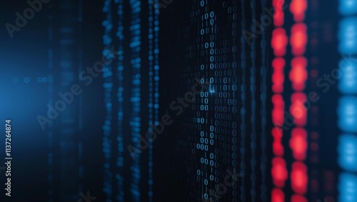 A digital display of binary code, featuring a blend of blue and red elements, suggesting data processing or cybersecurity themes.
