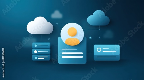 A digital illustration depicting user profiles, cloud storage, and data connections in a modern, tech-oriented design.