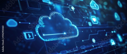 A digital illustration of cloud technology with icons and data, representing the flow between clouds in network security Generative AI