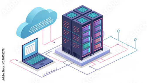 A digital illustration showing a server rack connected to a cloud and a laptop, representing cloud computing and data storage technology.