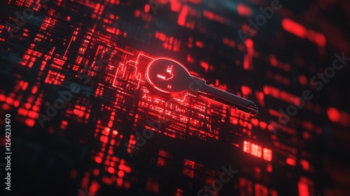 A digital key hovering over a matrix of encrypted data, symbolizing decryption processes.