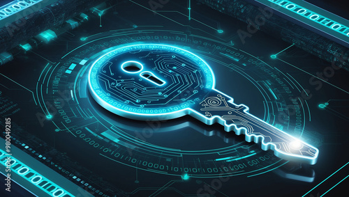 A digital key with circuit patterns, surrounded by binary codes and a futuristic interface, representing cybersecurity, encryption, and data protection.