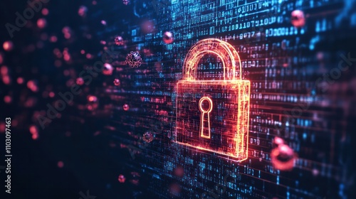 a digital lock made of binary code, with particles representing quantum bits (qubits) surrounding it,