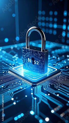 A digital lock rests on a glowing circuit board