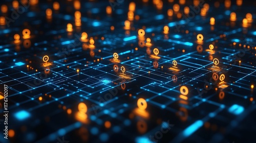 A digital network of glowing nodes and connections, representing data flow and technology.