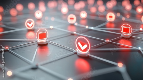 A digital network with glowing red icons representing tasks, files, and notifications interconnected on a dark background, suggesting a modern tech interface.