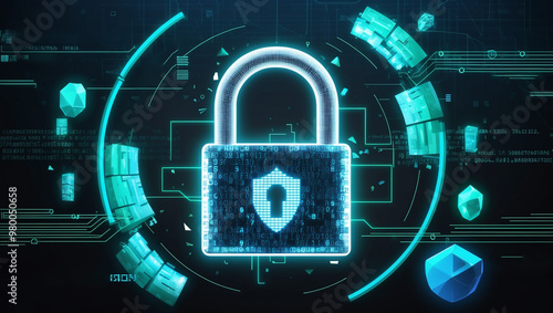 A digital padlock surrounded by binary codes and abstract elements, symbolizing cybersecurity, encryption, data protection, and secure digital communication.