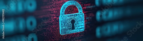 A digital padlock symbol representing cybersecurity and data protection amidst binary code and a high-tech background.