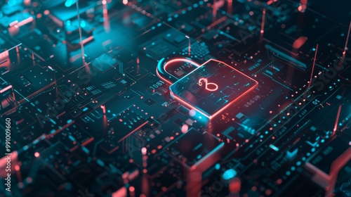 A digital representation of a secure system is visualized with a lock icon embedded on a circuit board, symbolizing cybersecurity and data protection.