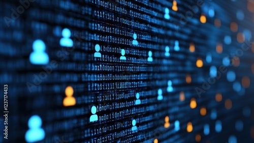 A digital representation of user icons against a backdrop of binary code, symbolizing data connectivity and digital interactions.