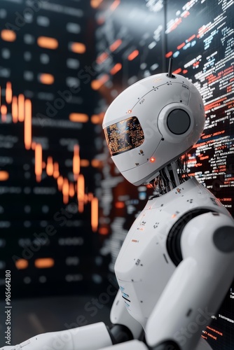 A digital robot trader optimizing trading patterns, with just a few essential data points floating around in a serene environment