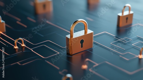 A digital scene featuring padlocks symbolizing cybersecurity, interconnected lines representing data flow and protection in a modern tech environment.