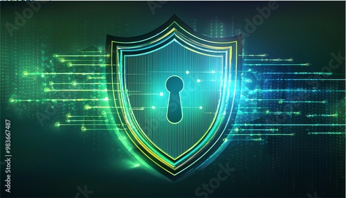 A digital shield with a keyhole, representing cybersecurity and protection, surrounded by glowing data streams.