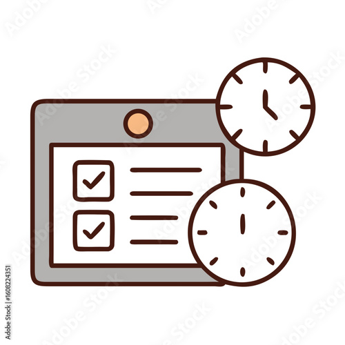 A digital tablet displaying a completed checklist alongside two analog clocks, symbolizing time management and task completion.