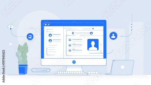 A digital workspace featuring a computer screen with user interface elements and a plant.