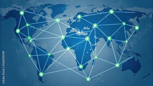 A digital world map with interconnected nodes and lines representing global communication and networking.