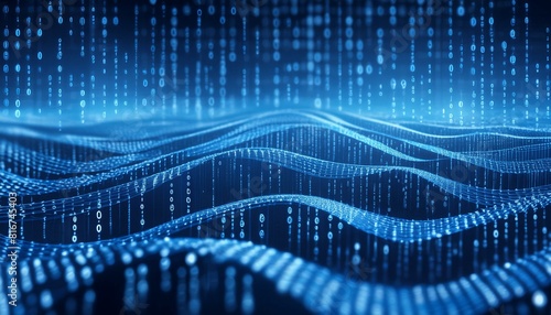 A digital-inspired background with a matrix of faint blue binary code on a deep blue base.