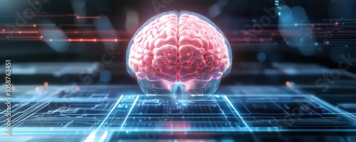 A digitally rendered brain surrounded by glowing circuits, representing advanced technology, neuroscience, and artificial intelligence.