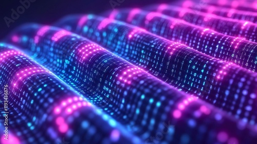A digital-themed composition featuring glowing numbers and dots arranged in a flowing pattern representing data streams and software programming concepts