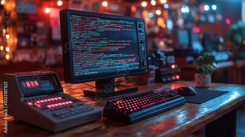 A dimly lit workspace featuring a computer with code, a vintage calculator, and ambient lights.