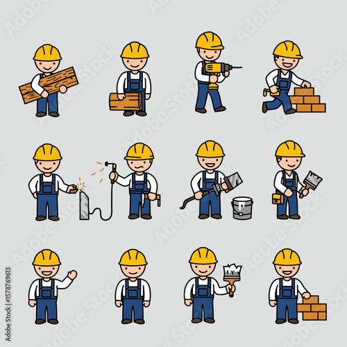A diverse collection of cheerful cartoon construction workers in various poses and actions, illustrating different building trades and tools.