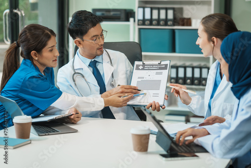 A diverse group of healthcare professionals, including doctors, nurses, and specialists, engaging in a collaborative meeting to discuss medical cases and share expertise in a hospital