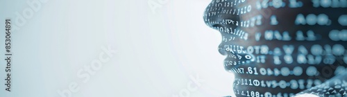 A double exposure image features an AI robot and DNA helixes, along with digital code, depicted in profile with its hand on its chin, all set against a white background for a contemplative look.