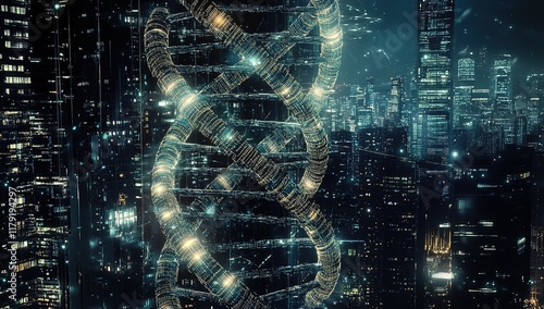 A double helix DNA chain is seen against the backdrop of an illuminated cityscape at night, with digital connections and symbols representing advanced biotechnology in futuristic medical research.