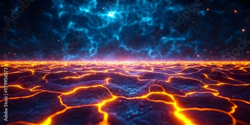 A dramatic landscape featuring glowing lava cracks against a dark, cosmic background with blue and purple hues. Concept Dramatic Landscape, Glowing Lava Cracks, Cosmic Background