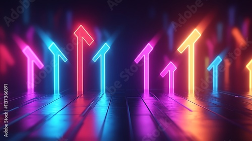 A dynamic 3D financial graph with bold ascending arrows glowing in vibrant neon gradients, set against a sleek black digital background, soft reflections, intricate details,