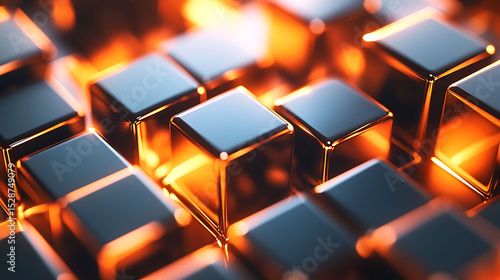 A dynamic abstract background of metallic cubes in a range of warm hues like amber and orange, with light sources coming from various angles to create captivating shadows and reflections,