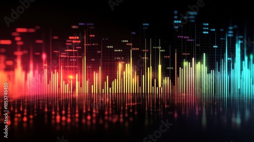 A dynamic candlestick chart showcases market fluctuations, with red and green bars illustrating price movements. This digital representation highlights trading activity and trends.