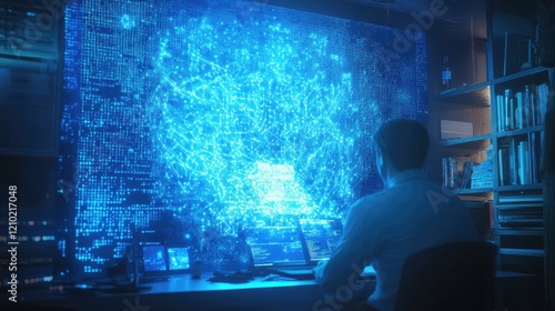 A dynamic visual of a programmer coding while a 3D AI hologram of code elements pops out of the screen, glowing in blue.