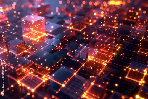 A dynamic wireframe visualization of network traffic, data packets represented by small, glowing cubes moving along lines