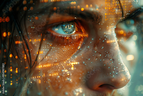 A face with semi-transparent virtual icons and binary code floating in the air