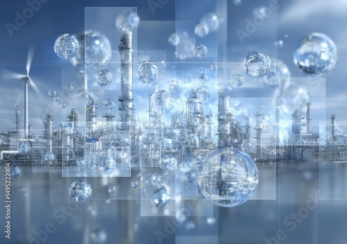 A facility for producing hydrogen, focusing on eco-friendly energy through H2 molecules stored in spherical tanks, promoting regenerative energy and advancements in fuel production via hydrogen