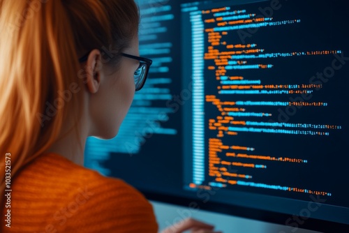 A female programmer working on a computer, with lines of code visible on the screen, symbolizing software development and technology.