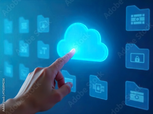 a finger touching a cloud icon, surrounded by document icons, suggesting cloud computing and data security concepts in a digital environment.