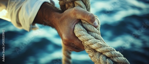 A firm grip on a thick rope, with a backdrop of gentle waves, evokes courage and determination amidst an open sea journey.